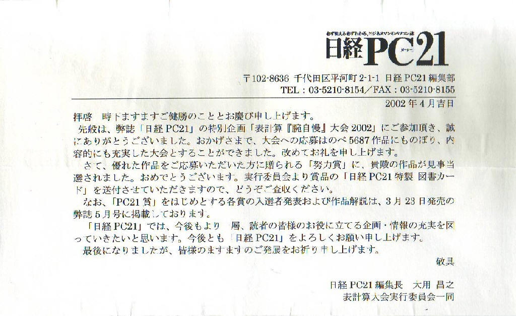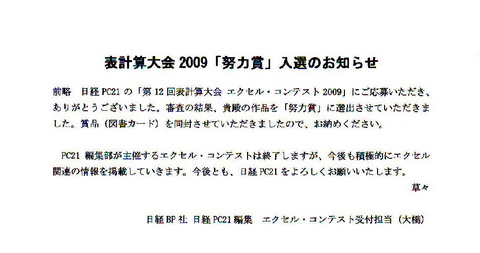 | Excel Soft 受 賞 (月刊誌 日経PC21、エクセルソフト表計算腕自慢大会) 2002年・・・努力賞 応募作品5,687、受賞327(内上位賞は27)